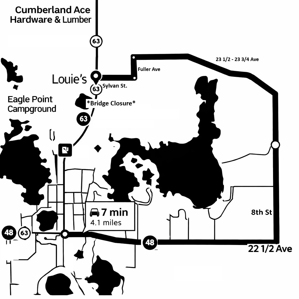 Update 4/24/26: The Highway 63 and Lake Street bridges are closed. You will need to use alternate routes to get to Louie's and around Cumberland.